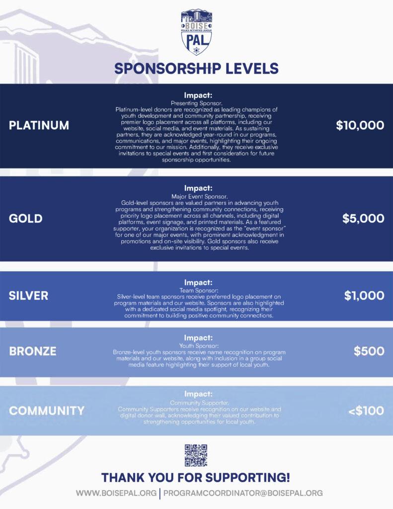 Boise PAL is a 501(c)(3) nonprofit organization, and our success depends on strong partnerships with businesses and community stakeholders. We invite you to join us as a sponsor and make a lasting difference in the lives of youth in our community.